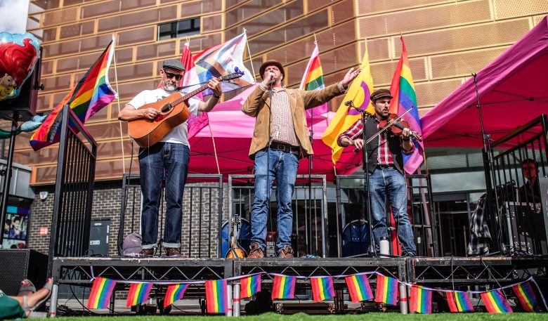 Andy Bannister, Dan Cox and Paul Burgess at Deptford Pride 2019. Photo by Dino Paciulli